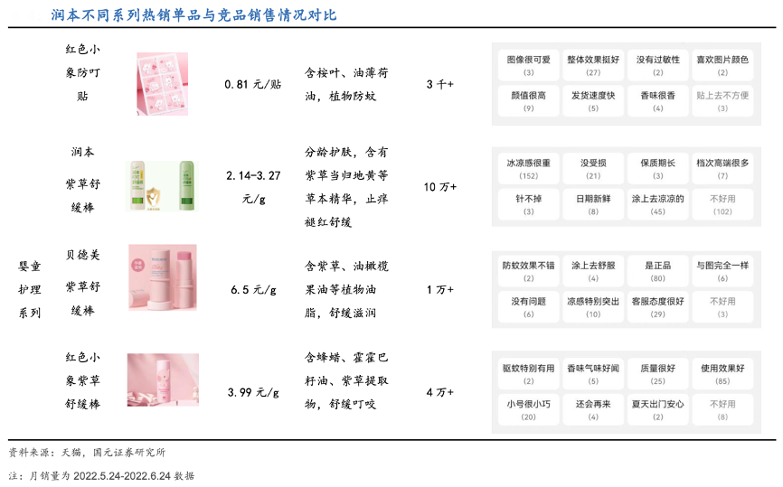 經(jīng)典案例:根據(jù)天貓、國元證券研究所等綜合資訊表明,相比于國內(nèi)外同類產(chǎn)品,潤本依托明星單品人氣,并利用自身長期積累的品牌“勢能”,其圍繞相關(guān)細(xì)分方向推出如精油貼、驅(qū)蚊手環(huán)、舒緩紫草膏,嬰兒液體爽身粉等產(chǎn)品, 以滿足需求日趨精細(xì)化的消費(fèi)者并逐步抬升自身發(fā)展天花板。