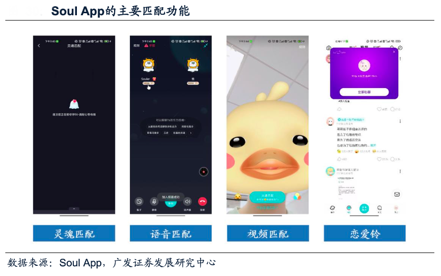 經(jīng)典案例:根據(jù)Soul App、廣發(fā)證券發(fā)展研究中心等綜合資訊表明,Soul形成“社區(qū)+匹配”相結(jié)合的功能特點(diǎn),成為Z世代用戶重要交友社區(qū)。其匹配功能主要聚合在“星球”頁(yè)面,包括靈魂匹配(系統(tǒng)直接分配聊天對(duì)象)、語(yǔ)音匹配、萌面匹配(用戶最開(kāi)始以虛擬形象視頻聊天),系統(tǒng)也會(huì)通過(guò)戀愛(ài)鈴功能為用戶推送附近的聊天對(duì)象(用戶可以選擇關(guān)閉戀愛(ài)鈴)。