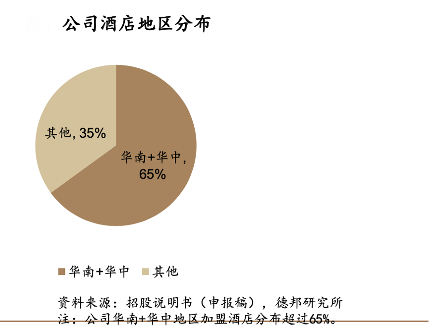 經(jīng)典案例:根據(jù)招股說(shuō)明書(申報(bào)稿)、德邦研究所等綜合資訊表明,東呈酒店始終持續(xù)深耕華南、華中地區(qū),兩個(gè)地區(qū)加盟酒店分布超過(guò)65%,同時(shí)收入占比2021年分別達(dá)到42.98%、27.64%。其在持續(xù)深耕華南區(qū)域和華中區(qū)域基礎(chǔ)上,不斷向華東、西南、華北等地區(qū)拓展,形成以華中華南為根基、全國(guó)市場(chǎng)發(fā)展的局面。