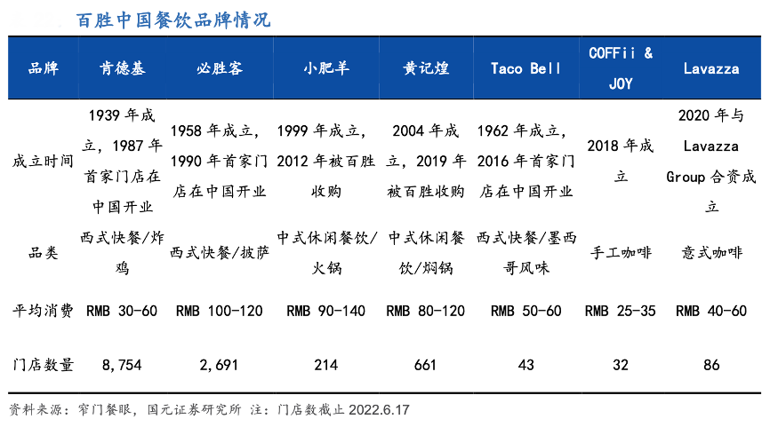 經(jīng)典案例:根據(jù)窄門餐眼、國元證券研究所等綜合資訊表明,百勝中國是國內(nèi)西式連鎖快餐龍頭,全國門店數(shù)超12000 家。目前其旗下餐廳網(wǎng)絡(luò)包括旗艦品牌肯德基和必 勝客,以及小肥羊、黃記煌、COFFii & JOY、塔可貝爾及 Lavazza 等新興品牌,形成涵蓋西式快餐、中餐以及咖啡等多品類的品牌矩陣。截止 2022 年 3 月 31 日根據(jù)公司財報披露,百勝中國在國內(nèi)的門店數(shù)量共計 12117 家,覆蓋全國超過 1700 家城市。