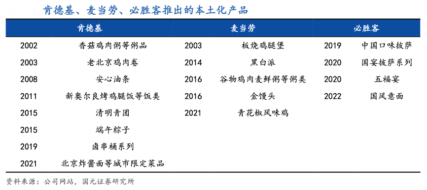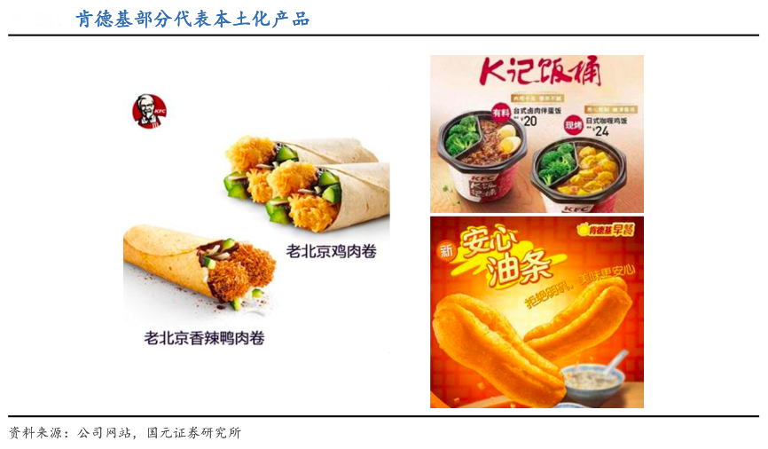 經(jīng)典案例:根據(jù)公司網(wǎng)站、國元證券研究所等綜合資訊表明,肯德基在保留品牌核心產(chǎn)品的基礎(chǔ)上,通過調(diào)研掌握國人飲食文化與飲食習慣,創(chuàng)新研發(fā)出市場覆蓋率更高,和國人傳統(tǒng)飲食風格接近的新品種。如 2000 年 邀請國內(nèi)食品營養(yǎng)專家成立食品健康委員會,每年推出 30-40 款新品,其中一半以上是具有中餐特色的產(chǎn)品。例如先后在北京地區(qū)推出類似北京烤鴨的“老北京雞肉卷”,在上海地區(qū)推出“枸杞南瓜粥”等粥類,在全國推出“安心油條”、豆?jié){、K記飯桶等產(chǎn)品。