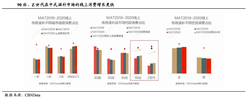 經(jīng)典案例:根據(jù)CBNData、國泰君安證券研究等綜合資訊表明,85后、90后通常能做到堅(jiān)持不斷,將中式養(yǎng)生食品作為日常食用的健康食品,例如隨身攜帶阿膠糕、紅棗枸杞丸、人參果凍等即食產(chǎn)品,方便隨時(shí)食用。據(jù)CBNData 發(fā)布的《2020 中式養(yǎng)身行業(yè)洞察》,90后在中式滋補(bǔ)市場的線上消費(fèi)增速明顯高于市場整體增速。