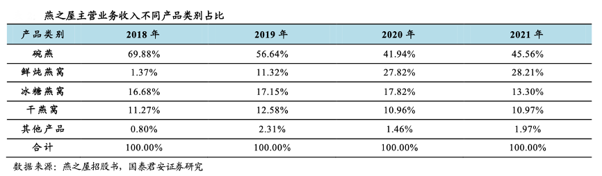 經(jīng)典案例:根據(jù)燕之屋招股書(shū)、國(guó)泰君安證券研究等綜合資訊表明,燕之屋2018-2021年的按產(chǎn)品類別收入中,干燕窩占比基本在10%左右,即食燕窩(包括碗燕、冰糖燕窩)占比從 86%下降到 60%以下,鮮燉燕窩占比從 1%迅速提升至28%。其他細(xì)分品類如燕窩粽子、燕窩月餅、燕窩 糕點(diǎn)等“燕窩+”產(chǎn)品處于起步階段,僅占主營(yíng)業(yè)務(wù)總收入的 2%左右。