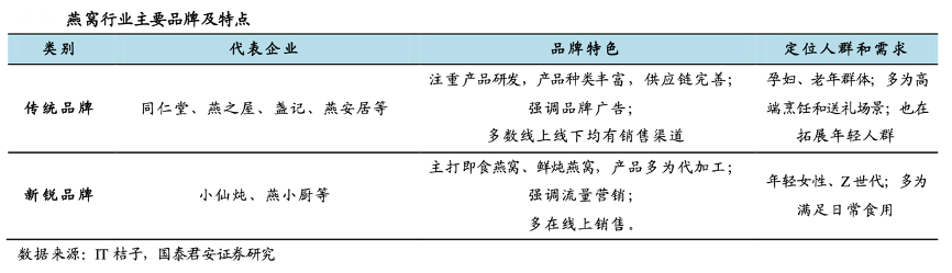 經(jīng)典案例:根據(jù)IT桔子、國(guó)泰君安證券研究等綜合資訊表明,燕窩市場(chǎng)包括傳統(tǒng)品 牌和新銳品牌兩類玩家。新銳品牌如小仙燉、燕小廚等,其對(duì)傳統(tǒng)滋補(bǔ)食材進(jìn)行升級(jí),側(cè)重于線上渠道、流量營(yíng)銷(xiāo)方式,產(chǎn)品主打即食燕窩、鮮燉燕窩,更好的滿足年輕人群日常休閑食用的需求。