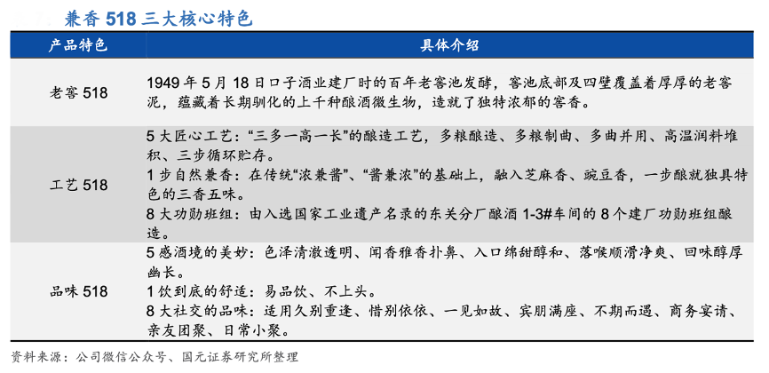 經(jīng)典案例:根據(jù)公司微信公眾號(hào)、國元證券研究所等綜合資訊表明,兼香518于口子窖建廠紀(jì)念日 2021 年 5 月18 日上市,嚴(yán)格遵循公司“多糧釀造、多糧制曲、多曲并用、高溫潤料堆積、三步循環(huán)貯存”的五大核心工藝,其蘊(yùn)含“好事總有你”的美好寓意。作為公司重點(diǎn)發(fā)展的創(chuàng)新單品,兼香518主要投放于團(tuán)購渠道,定位次高端市場,填補(bǔ)公司占位空白。