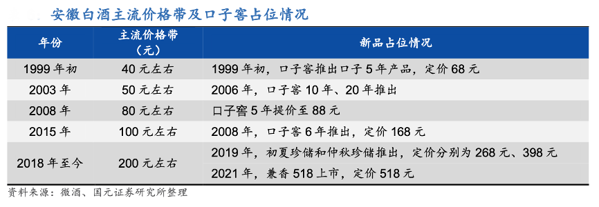 經(jīng)典案例:根據(jù)微酒、國元證券研究所等綜合資訊表明,口子窖公司于 2008 年推出口子窖 6 年,2011 年 推出口子窖 30 年,2013 年推出口子美酒,并持續(xù)加強(qiáng)旗下各系列產(chǎn)品的營銷。2020 年推出周年紀(jì)念版,試水 800 元以上價(jià)格區(qū)間。 2021 年 5 月 18 日,推出創(chuàng)新單品兼香 518,重點(diǎn)發(fā)力次高端市場。