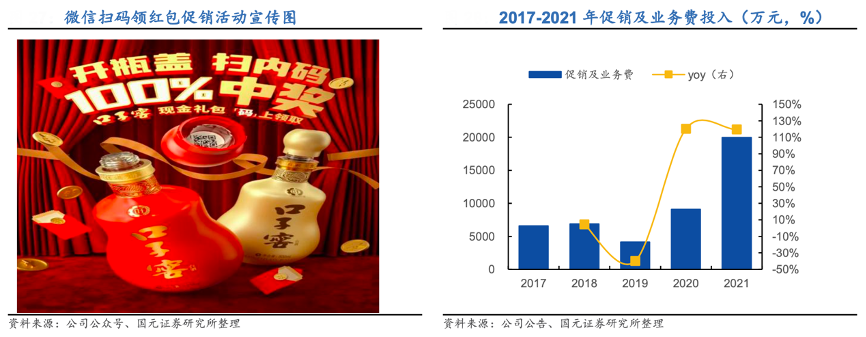 經(jīng)典案例:根據(jù)公司公眾號、公司公告、國元證券研究所等綜合資訊表明,2020年、2021年口子窖公司加大促銷及業(yè)務(wù)推廣投入,促銷及業(yè)務(wù)費(fèi)用連續(xù)兩年增速達(dá)到120%,尤其是在 2021 年第四季度消費(fèi)旺季加大投放力度。根據(jù)促銷活動規(guī)則,消費(fèi)者只要通過微信掃碼,就有 100% 的機(jī)率領(lǐng)取現(xiàn)金紅包、累計積分、兌換禮品。一系列促銷活動提高了消費(fèi)者積極性,活躍了終端市場。