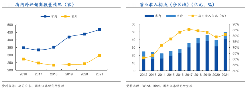 經(jīng)典案例:根據(jù)公司公告、wind、lfind、國元證券研究所等綜合資訊表明,口子窖穩(wěn)住省內(nèi)市場基本盤,加速省外重點(diǎn)地區(qū)市場開拓。2016 年以來,公司省內(nèi)收入穩(wěn)定在 8 成左右,2021年省內(nèi)收入 40.78 億元,其優(yōu)先集中資源發(fā)展省內(nèi)市場,建立了穩(wěn)固的省內(nèi)基本盤。2016-21 年,省外收入占比及經(jīng)銷商數(shù)量呈先降后升趨勢,近年來公司省外招商力度加大,產(chǎn)品在全國范圍的影響力提升。