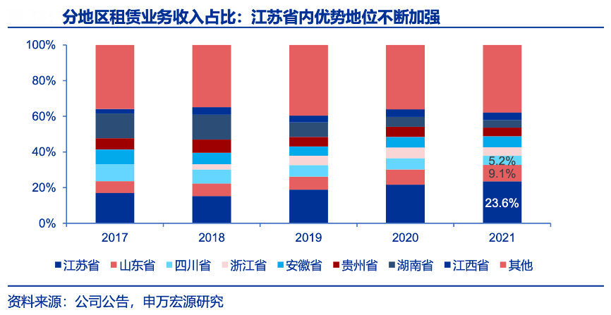 經(jīng)典案例:根據(jù)公司公告、申萬宏源研究等綜合資訊表明,江蘇租賃公司立足江蘇省、鞏固公司在省內(nèi)的核心優(yōu)勢,并將業(yè)務(wù)積極向融資租賃需求較大的地區(qū)拓展,近年來江蘇省租賃業(yè)務(wù)收入比例不斷上升,從 2018 年的15.3%升至2021年的23.6%,其余地區(qū)業(yè)務(wù)分布較為分散,主要集中在山東、四川、浙江、安徽等地。