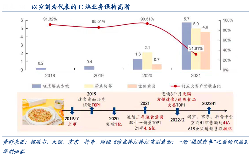 經(jīng)典案例:根據(jù)招股書、天貓、京東、抖音、財(cái)經(jīng)《誰在捧紅捧紅空刻意面:一場“渠道變革”之后的雙贏》、華創(chuàng)證券等綜合資訊表明,空刻意面 2019 年 7 月創(chuàng)立,在拉 面說/自嗨鍋等中式速食品牌涌現(xiàn)的背景下,切入西式速食。當(dāng)年就成為速食意面品類銷 量 TOP1,2020年銷售額突破 1 億。