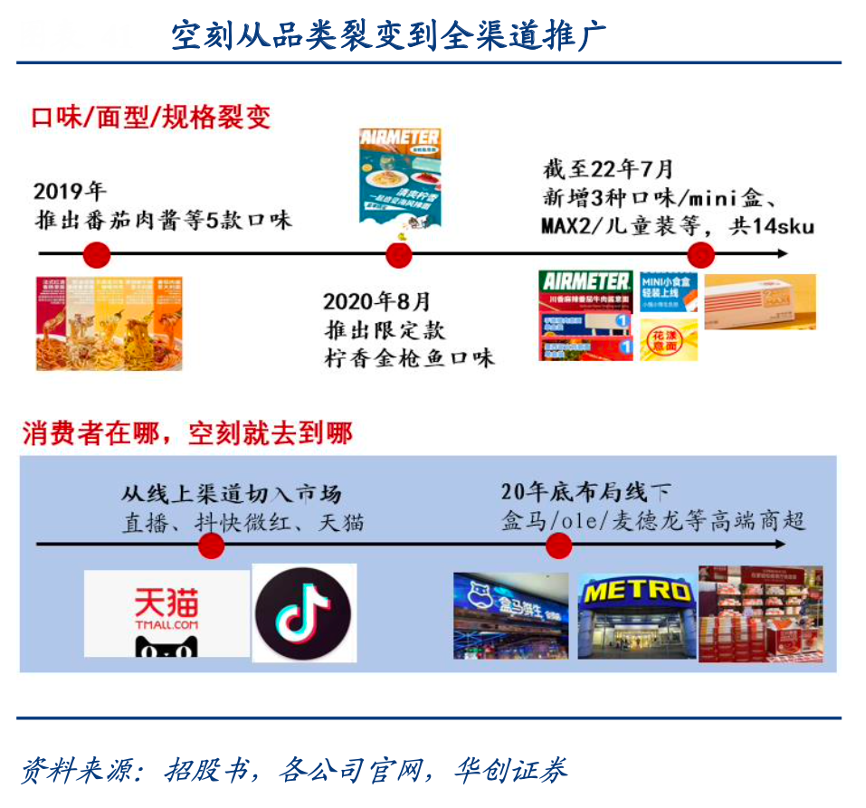 經(jīng)典案例:根據(jù)招股書、各公司官網(wǎng)、華創(chuàng)證券等綜合資訊表明,空刻在 2019 年初次上線 時包含番茄肉醬等 5 款經(jīng)典口味,目前已新增川香、手撕豬肉和墨西哥火雞 3 種新口味。同時在面型和規(guī)格也積極創(chuàng)新,推出螺旋意面款、mini 小食盒和 MAX2 盒。渠道方面,空刻在線上強勢起家背景下,2020年底開始線下布局,注重用戶密度,基于產(chǎn)品定位,緊跟精致寶媽和新銳白領,聚焦 Ole、盒馬等高協(xié)同性的線下渠道。