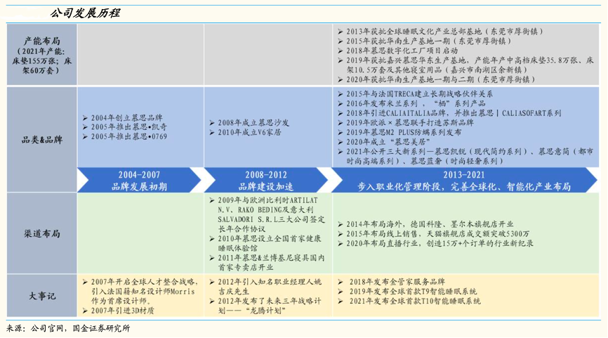 經(jīng)典案例:根據(jù)公司官網(wǎng)、國金證券研究所等綜合資訊表明,慕思公司2013 年開始步入職業(yè)化管理階段,品牌、產(chǎn)能、渠道布局持續(xù)完善,全球化、智能化布局也正推進。