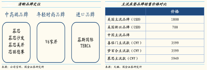 經(jīng)典案例:根據(jù)公司官網(wǎng)、天貓、國金證券研究所等綜合資訊表明,慕思公司主品牌慕思整體定位中高端,依托子品牌搶占其余細分市場。大眾市場方面,公司依托 V6 品牌進行布局,而高端市場分別用 TERCA、思麗德賽等進口 品牌進行布局。