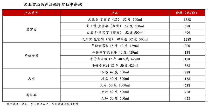 經(jīng)典案例:根據(jù)京東、文王貢酒官網(wǎng)、東亞前海證券研究所等綜合資訊表明,文王貢酒定位中高端,包含皇宮宴、年份專家、人生、新經(jīng)典四個系列。其中的皇宮宴系列價(jià)格在 588 元/瓶~1588 元/瓶之間,產(chǎn)品包括文王貢皇宮宴(席)、文王貢皇宮宴(紅貢)、文王貢皇宮宴(藍(lán)貢)等。