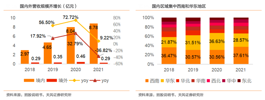 經(jīng)典案例:根據(jù)招股說明書、天風證券研究所等綜合資訊表明,分地區(qū)來看,阿寬食品國內(nèi)市場的營收占比72%左右,主要集中于西南和華東區(qū)域。西南地區(qū)為公司總部及主要工廠所在,品牌知名度和市場認可度較高,銷售渠道較為健全;華東地區(qū)居民消費能力強,方便食品消費需求較大,公司定制銷客戶集中。