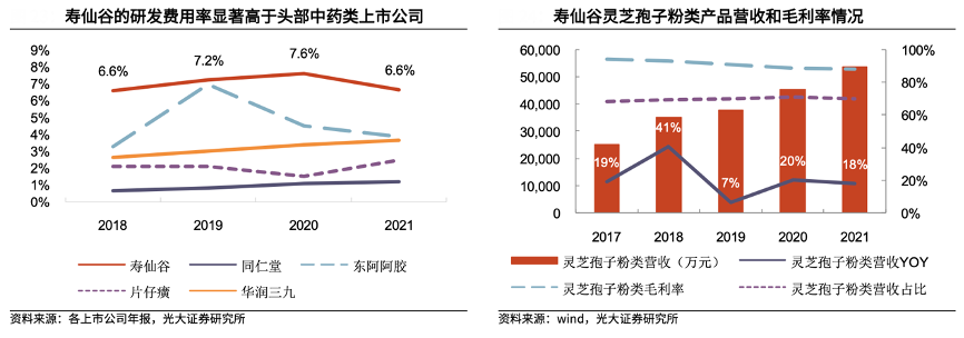 經(jīng)典案例:根據(jù)各上市公司年報、wind、光大證券研究所等綜合資訊表明,壽仙谷公司靈芝孢子粉類產(chǎn)品營收穩(wěn)健增長,毛利率保持高位。其靈芝孢子粉系列產(chǎn)品占公司總營收的70%左右,2017-2021 年該產(chǎn)品營收復(fù)合增速為20.9%。