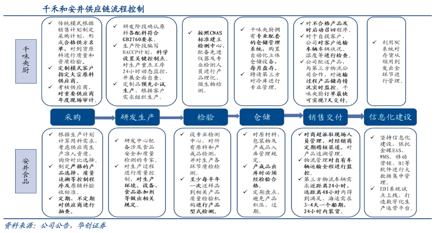 經(jīng)典案例:根據(jù)公司公告、華創(chuàng)證券等綜合資訊表明,千味央廚已形成全流程完備供應(yīng)鏈。采購(gòu)端方面,公司聯(lián)合眾品、黃河金等食材商共同成立了餐飲食材聯(lián)盟,與供應(yīng)商合作在全國(guó)建立蔬菜基地,并要求供應(yīng)商提供相應(yīng)檢測(cè)報(bào)告。質(zhì)控端方面,其引入無(wú)死角監(jiān)控系統(tǒng),同時(shí)配備專(zhuān)業(yè)質(zhì)檢團(tuán)隊(duì)監(jiān)測(cè)各工藝節(jié)點(diǎn),保證生產(chǎn)嚴(yán)格按流程進(jìn)行。