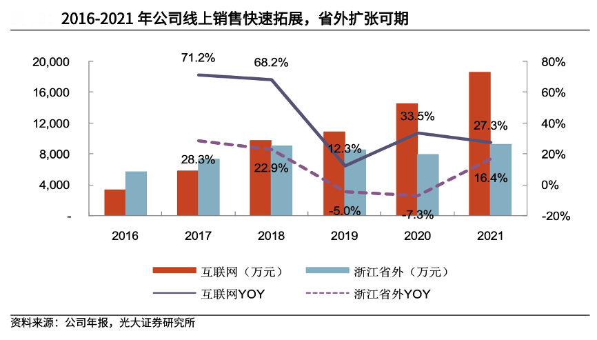 經(jīng)典案例:根據(jù)公司年報(bào)、光大證券研究所等綜合資訊表明,2021年壽仙谷公司成立浙江壽仙谷濟(jì)世健康發(fā)展有限公司試水全國(guó)城市代理商模式,當(dāng)年新增了 10 家代理商,省外營(yíng)收同比增長(zhǎng) 16.43%至 9200 多萬(wàn)元。在產(chǎn)品劑型上,其以靈芝孢子粉片劑為主要招商和推廣類(lèi)型。孢子粉片解決了粉劑沖泡苦味濃郁的問(wèn)題,同時(shí)攜帶和服用方便,更適合全國(guó)化發(fā)展。