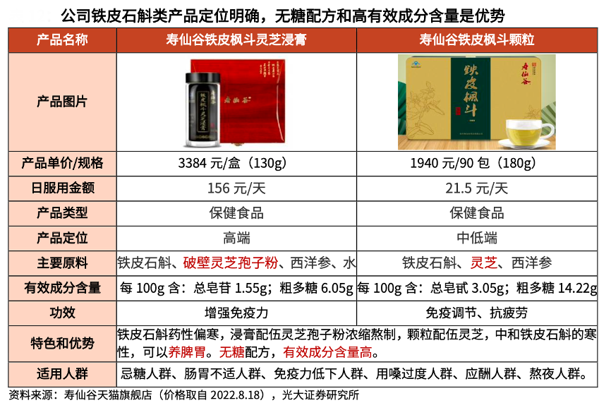 與鐵皮石斛類(lèi)頭部競(jìng)品相比,壽仙谷公司的鐵皮楓斗顆粒采用無(wú)糖配方,其有效成分含量明 顯更高,性價(jià)比突出,而鐵皮楓斗靈芝浸膏采用了破壁靈芝孢子粉和西洋參配伍,相比競(jìng)品成分更為高端和豐富,凸顯產(chǎn)品特色。