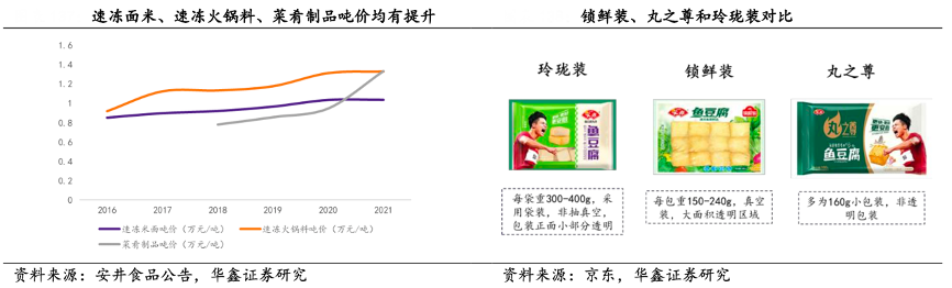 經(jīng)典案例:根據(jù)安井食品公司、京東、華鑫證券研究等綜合資訊表明,2018年安井食品公司推出高端系列“丸之尊”,201 9 年和 2020 年分別推出鎖鮮裝 1.0 和 2.0,2021 年繼續(xù)在原有基礎(chǔ)上擴(kuò)張品類 推出 3.0,定位性價(jià)比+中高端品質(zhì),進(jìn)軍家庭市場(chǎng),推動(dòng)火鍋料市場(chǎng)高端化發(fā) 展,。