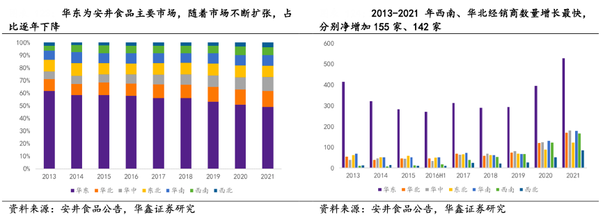 經(jīng)典案例:根據(jù)安井食品公告、華鑫證券研究等綜合資訊表明,安井食品公司以華東為中心,逐步開(kāi)拓東北、華南、西南、西北等非強(qiáng)勢(shì)區(qū)域,構(gòu)建高密度銷售網(wǎng)絡(luò)。2013-2021年其西南、華北經(jīng)銷商數(shù)量增長(zhǎng)最快,分別凈增加155家、142家。