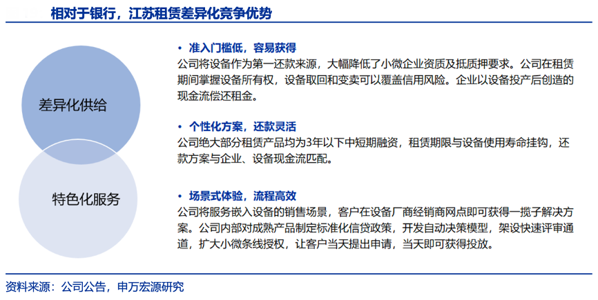 經典案例:根據公司公告、申萬宏源研究等綜合資訊表明,江蘇租賃公司差異化定位于中小客戶,其在準入門檻、還款方案、申請流程上培育起相對于銀行的競爭優(yōu)勢:1)準門檻低,不需要抵質押物;2)還款方案個性化,與企業(yè)現(xiàn)金流匹配;3)流程高效,中小企業(yè)在銀行等金融機構貸款流程周期長,而江蘇租賃最快當天就可獲得投放。
