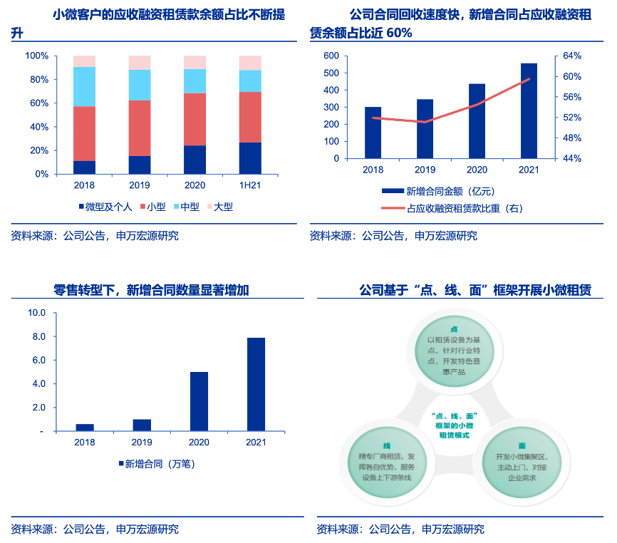 經典案例:根據公司公告、申萬宏源研究等綜合資訊表明,江蘇租賃公司不斷加強微型及個人客戶、小型客戶的開發(fā),微型及個人客戶、小型客戶的應收租賃款余額從 2018 年末的 332 億元大幅上升至 1H21 的 642 億元,增長近翻倍,余額占比也從 2018 年末的 57.3% 上升至 2021 年 6 月末的 69.4%。2021 公司小微客戶數(shù) 4.5 萬個,同比增 74%;小微客 戶投放金額 265 億元,同比增 31%。差異化定位與商業(yè)銀行、大型銀行系金租等形成錯位競爭,“大批量、小金額”的零售金融特征逐步顯現(xiàn)。