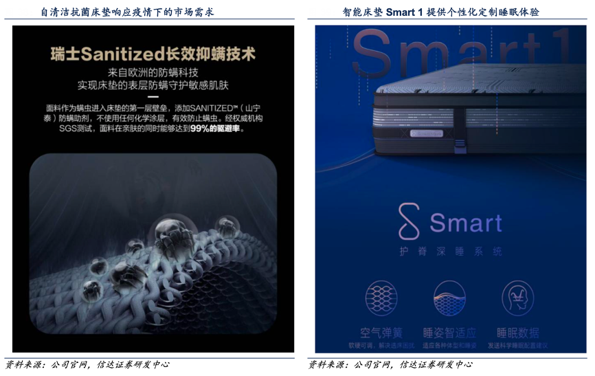 經(jīng)典案例:根據(jù)公司官網(wǎng)、信達證券研發(fā)中心等綜合資訊表明,喜臨門公司對現(xiàn)有產(chǎn)品系列“凈眠”、“法詩曼”、“可尚”、“喜眠”、“愛爾娜”等進行全面升級,其積極布局智能產(chǎn)品,發(fā)布全新智能床墊 Smart 1, 構(gòu)建完整的智能睡眠產(chǎn)品體系,C端對接華為智慧生活平臺,B端跟涂鴉和華住簽訂戰(zhàn)略合作協(xié)議,共同孵化智能睡眠市場。