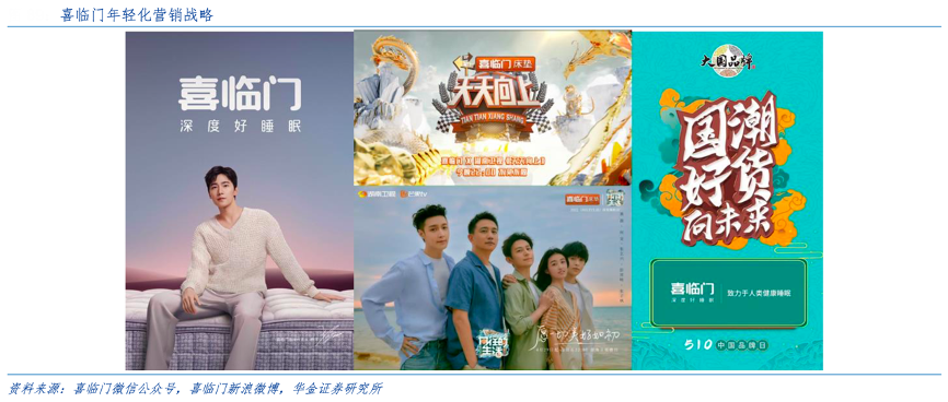經(jīng)典案例:根據(jù)喜臨門微信公眾號、喜臨門新浪微博、華金證券研究所等綜合資訊表明,喜臨門公司自 2020 年開始積極推進品牌轉(zhuǎn)型升級,全面擁抱年輕圈層,2021 年官宣新生代知名演員楊洋作為品牌代言人,微博話題#楊洋喜臨門品牌代言人#閱讀次數(shù)累計達 6 億,討論次數(shù)累計達 184 萬。此外,公司相繼贊助《天天向上》、《奔跑吧兄弟》、 《向往的生活》等 8 檔受年輕人喜愛的頂級綜藝節(jié)目,助推品牌“出圈”。
