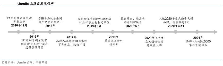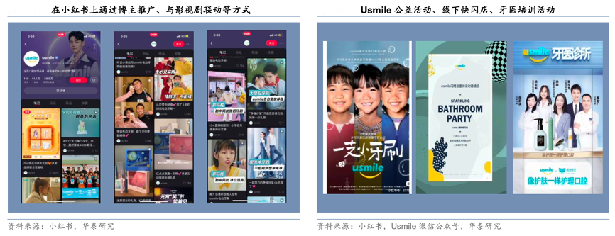 經(jīng)典案例:根據(jù)小紅書、Usmile微信公眾號、華泰研究等綜合資訊表明,2017 年,Usmile 看中了正處于上升期的小紅書,彼時其 Y1 系列新品剛上市,Y1 延續(xù) U1 的馬卡龍配色,外觀更加清新少女,在以女性為主要用戶群的小紅書,Y1 系列迅速走紅,至今銷量突破 405 萬,目前仍然是 Usmile 最受歡迎的產(chǎn)品。同時截至 21 年 5 月,Usmile 品牌入駐超 5000 家線下門店,其中包括屈臣氏、 伊藤洋華堂、銀泰西選、三亞免稅等中高端渠道,其中美妝店超 4500 家,這也符合品牌聚焦年輕女性消費(fèi)者的定位。