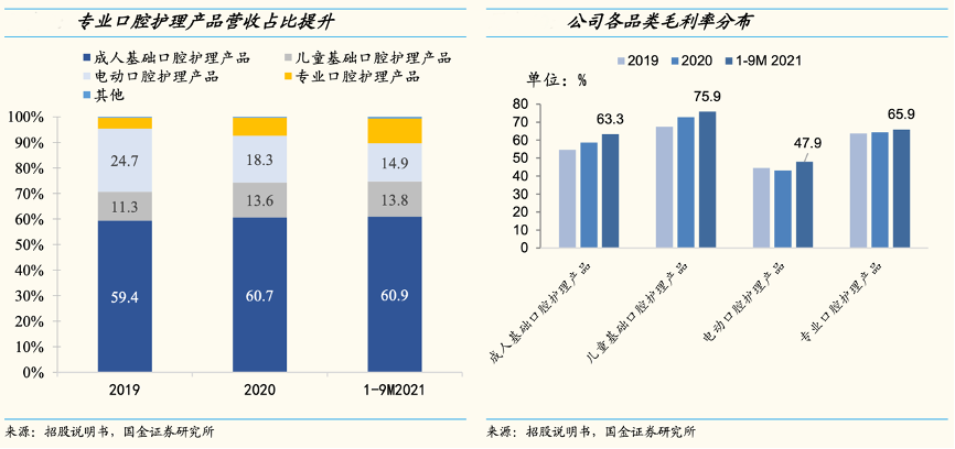 經(jīng)典案例:根據(jù)招股說明書、國(guó)金證券研究所等綜合資訊表明,薇美姿以牙膏&牙刷基礎(chǔ)護(hù)理為基,電動(dòng)、專業(yè)護(hù)理多點(diǎn)開花。2021年前三季度,公司成人、兒童基礎(chǔ)口腔護(hù)理產(chǎn)品(以牙膏&牙刷為主)營(yíng)收分別達(dá) 7.5/1.7 億元,同比增長(zhǎng) 18.5%/12.2%。電動(dòng)口腔護(hù)理產(chǎn)品營(yíng)收連續(xù)下降,專業(yè)口腔護(hù)理產(chǎn)品營(yíng)收年均增速60%。