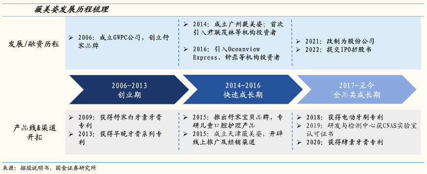 經典案例:根據招股說明書、國金證券研究所等綜合資訊表明,薇美姿于2015年,首次兒童賽道“舒客寶貝”品牌,向細分人群中高端全品類口腔護理戰(zhàn)略進軍。并于2020年,首次推出酵素牙膏并獲得酵素牙膏專利。