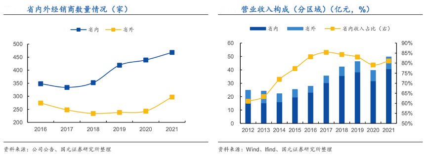經(jīng)典案例:根據(jù)公司公告、wind、lfind、國元證券研究所等綜合資訊表明,口子窖穩(wěn)住省內(nèi)市場基本盤,加速省外重點地區(qū)市場開拓。2016 年以來,公司省內(nèi)收入穩(wěn) 定在 8 成左右,2021年省內(nèi)收入 40.78 億元,占營業(yè)總收入的 81.09%。2016-2021年,省外收入占比及經(jīng)銷商數(shù)量呈先降后升趨勢,近年來公司省外招商力度加大,產(chǎn)品在全國范圍的影響力提升。