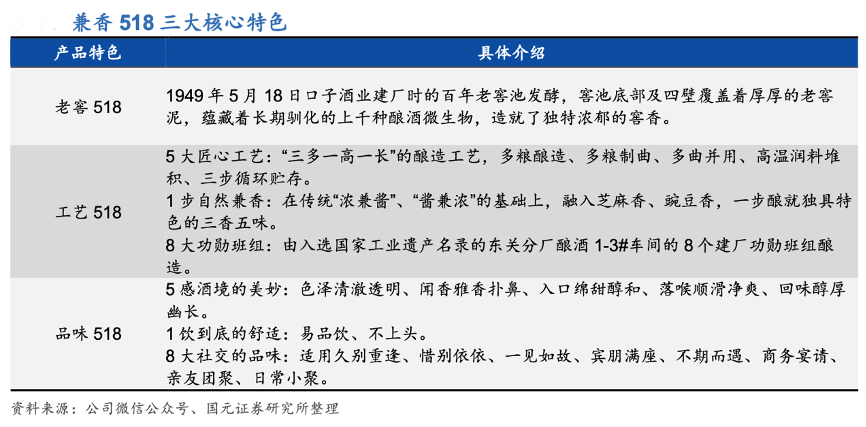 經(jīng)典案例:根據(jù)公司微信公眾號、國元證券研究所等綜合資訊表明,口子窖兼香 518 于口子窖建廠紀念日 2021 年 5 月 18 日上市,其嚴格遵循公司“多糧釀造、多糧制曲、多曲并用、高溫潤料堆積、三步 循環(huán)貯存”的五大核心工藝。兼香 518 蘊含“好事總有你”的美好寓意。作為公司重點發(fā)展的創(chuàng)新單品,兼香 518 主要投放于團購渠道, 定位次高端市場,填補公司占位空白。