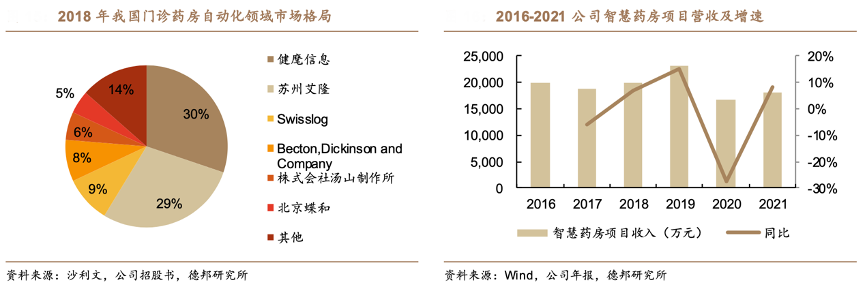 經(jīng)典案例:根據(jù)沙利文、公司招股書、公司年報、wind、德邦研究所等綜合資訊表明,健麾信息公司為門診藥房自動化領(lǐng) 域的龍頭企業(yè),根據(jù)沙利文數(shù)據(jù)統(tǒng)計,截至 2018 年末,公司在門診藥房自動化領(lǐng)域的市場占有率為30.2%。2019 年公司智慧藥房項目收入達到歷時最高 2.3 億 元,同比增長 15%。