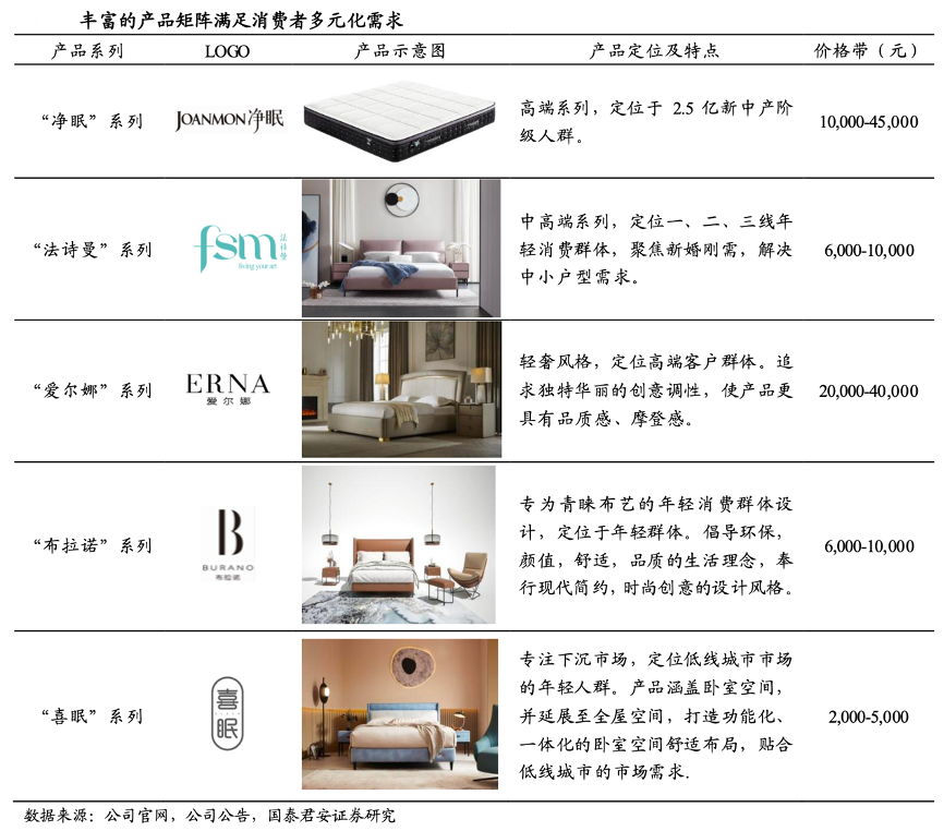 經(jīng)典案例:根據(jù)公司官網(wǎng)、公司公告、國泰君安證券研究等綜合資訊表明,為了迎合消費(fèi)者的多元化需求,喜臨門公司針對不同目標(biāo)客戶設(shè)計了不同系列的產(chǎn)品,其中包括主打保護(hù)脊椎、定位于2.5億新中產(chǎn)階級人群的“凈眠”系列;解決中小戶型需求,定位中高端的“法詩曼”系列等。2019 年,公司新推出了“喜眠”系列產(chǎn)品,這是喜臨門從中高端市場下沉到低端市場的一個嘗試,產(chǎn)品系列得到了進(jìn)一步擴(kuò)充。