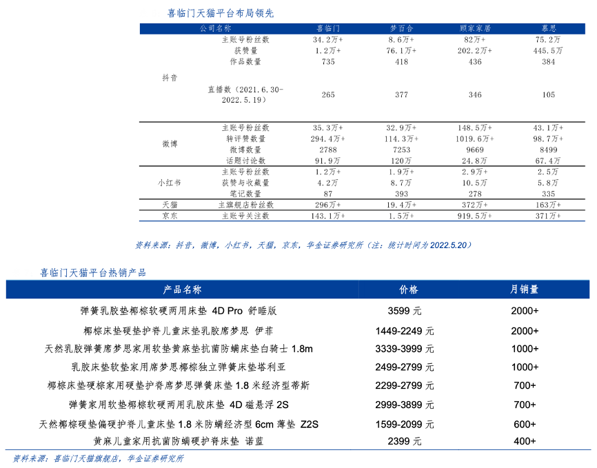 經(jīng)典案例:根據(jù)抖音、微博、小紅書、天貓、京東、喜臨門天貓旗艦店、華金證券研究所等綜合資訊表明,喜臨門公司線上熱銷產(chǎn)品價格帶主要在 1000-4000 元區(qū)間,更符合年輕群體的消費(fèi)能力;線下產(chǎn)品則主要以中產(chǎn)階級為主(新房裝修以及新婚人群),其產(chǎn)品價格帶主要在8000-10000元左右。
