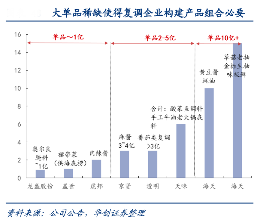 經(jīng)典案例:根據(jù)公司公告、華創(chuàng)證券等綜合資訊表明,與基礎(chǔ)調(diào)味料不同,復(fù)調(diào)更貼近餐飲和服務(wù),本身大單品稀缺,除底料頤海與辣醬老干媽外,行業(yè) 內(nèi)在 2-5 億的單品較少,大部分集中在 1 億以下,使得構(gòu)建產(chǎn)品組合與拓品類非常關(guān)鍵。