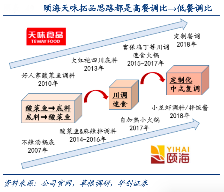 經(jīng)典案例:根據(jù)公司官網(wǎng)、草根調(diào)研、華創(chuàng)證券等綜合資訊表明,天味圍繞川調(diào)做多元化,并通過(guò)參股上游原料商、投資下游定制餐調(diào)企業(yè)打造產(chǎn)業(yè)生態(tài)圈,頤海則依托底料開發(fā)方便速食及中式復(fù)調(diào)。