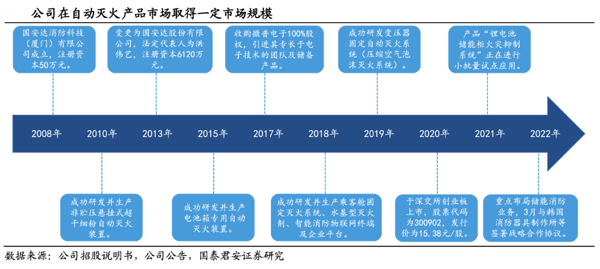 經(jīng)典案例:根據(jù)公司招股說明書、公司公告、國泰君安證券研究等綜合資訊表明,國安達(dá)加強(qiáng)布局儲(chǔ)能消防,快速搶占市場(chǎng)份額。其深耕鋰電池火災(zāi)防控技術(shù)十余年,技術(shù)領(lǐng)先性強(qiáng),用戶信任度高,于2021年末成功研發(fā)鋰電池儲(chǔ)能柜火災(zāi)防控和惰化抑爆系統(tǒng),并進(jìn)入小批量試用階段。