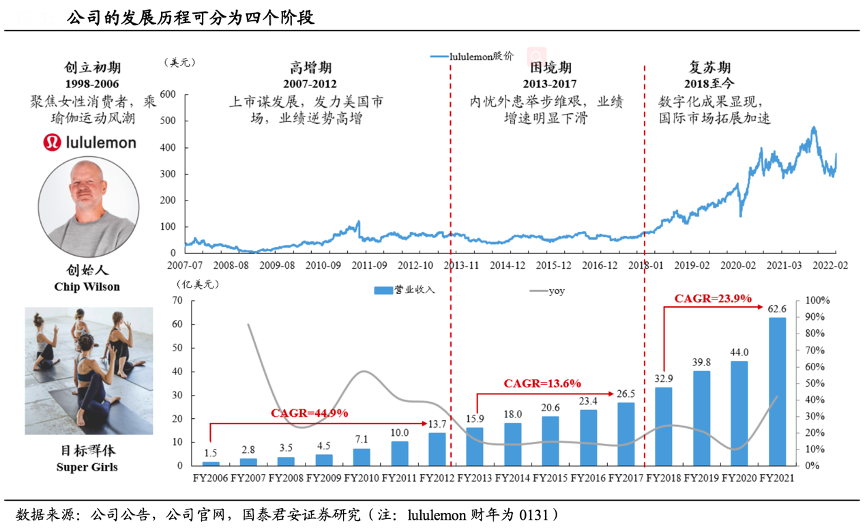 經典案例:根據公司公告、公司官網、國泰君安證券研究等綜合資訊表明,回顧 lululemon 二十余年的發(fā)展歷程,大致可分為創(chuàng)立初期、高增期、困境期及復蘇期等四個階段。