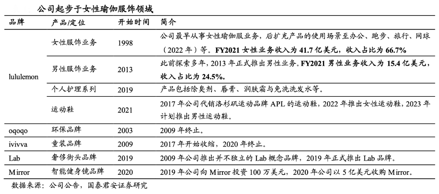 經典案例:根據公司公告、國泰君安證券研究等綜合資訊表明,露露樂蒙于1998 年在北美成立,以售賣女性瑜伽服起家,目前是全球知名的運動休閑品牌商、瑜伽領域龍頭。主品牌 lululemon 的業(yè)務從女性服飾拓展至男性服飾、個人護理及運動鞋領域,產品使用場景囊括瑜伽、跑步、網球、辦公及旅行等。此外,公司還通過自我孵化及收購方式擁有奢侈高街品牌 Lab 及智能健身鏡品牌 Mirror。