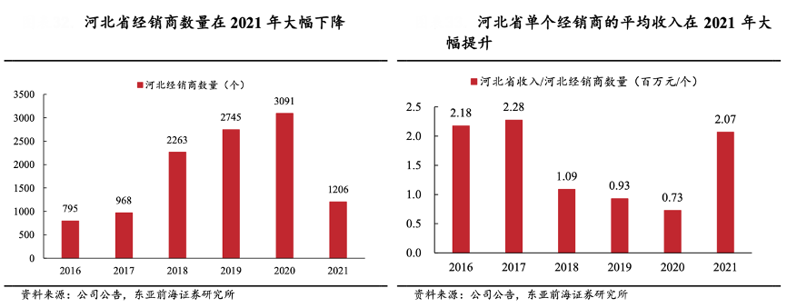 經(jīng)典案例:根據(jù)公司公告、東亞前海證券研究所等綜合資訊表明,老白干于2021年進(jìn)一步優(yōu)化營銷網(wǎng)絡(luò)布局,與整體實力較雄厚的經(jīng)銷商合作,加強對于經(jīng)銷商的業(yè)績考核,推進(jìn)經(jīng)銷商的優(yōu)勝劣汰。從數(shù)據(jù)上來看,2021年經(jīng)銷商數(shù)量同比減少 1885 個,同時單個經(jīng)銷商盈利能力提升,2021年河北單個經(jīng)銷商的收入達(dá)到 207 萬元,同比增長183.56%。