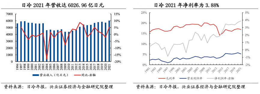 經(jīng)典案例:根據(jù)日冷年報、興業(yè)證券經(jīng)濟與金融研究院等綜合資訊表明,日冷集團以海產(chǎn)品起家,逐漸發(fā)展成為日本預(yù)制菜龍頭企業(yè)。日冷 2021 年營業(yè)總 收入達 6026.96 億日元(約 313.19 億 RMB),過去 10 年 CAGR 為2.85%,2021 年凈利率 3.88%。其擁有日冷食品(調(diào)理食品)、日冷物流(冷鏈物流)、日冷生鮮(海產(chǎn)品和畜禽產(chǎn)品)等主要子公司,形成了全產(chǎn)業(yè)鏈布局。