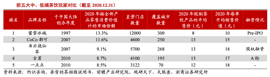 經(jīng)典案例:根據(jù)灼識咨詢、奈雪的茶招股說明書、前瞻產(chǎn)業(yè)研究院、觀研天下、天眼查、浙商證券研究所等綜合資訊表明,2020 年低端/中端茶飲占比約為 32%/49%,中低端合計占比約 81%,空間遠大于高端市場。此外,根據(jù)奈雪的茶招股書,2020年零售額市占率排名前五的中低端茶飲品牌分別是蜜雪冰城、CoCo都可、書亦燒仙草、古茗和一點點,CR2 約為 24.9%,CR5 約為 51.2%,低端茶飲市場集中度偏低,且不斷有新品牌涌現(xiàn),尚未跑出絕對龍頭,高端品牌正嘗試通過價格帶下沉搶占市場。