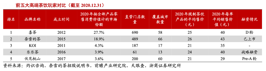 經(jīng)典案例:根據(jù)灼識咨詢、奈雪的茶招股說明書、前瞻產(chǎn)業(yè)研究院、天眼查、浙商證券研究所等綜合資訊表明,2020 年中國高端現(xiàn)制茶飲零售額占中國整體現(xiàn)制茶飲的 19.7%,而2025年,預計高端茶飲占比為 24.6%,高端現(xiàn)制茶飲份額有望持續(xù)提升。從門店數(shù)量占比來看,根據(jù)奈雪的茶招股書,截至 2020 年 12 月 31 日,中國約有34.8 萬間現(xiàn)制茶 飲店,其中高端現(xiàn)制茶飲店約 3400 家,高端門店數(shù)量占比約 1%。