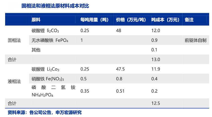 經(jīng)典案例:根據(jù)各公司公告、申萬宏源研究等綜合資訊表明,液相法單噸具有 5000 元左右的成本節(jié)省優(yōu)勢(shì):對(duì)原材料雜質(zhì)要求低,可以使用較高比例的工業(yè)級(jí)碳酸鋰,而固相法主要使用電池級(jí)別碳酸鋰,按照原材料價(jià)格高位計(jì)算,固相法單噸成本在 13 萬元左右,而液相法在 12.5 萬元左右。此外在能量消耗上,液相法熱處理溫度相對(duì)較低,比如德方納米采用液相法,燒結(jié)溫度 650-680°C, 低于固相法的 700-730°C,因此能耗成本略低。