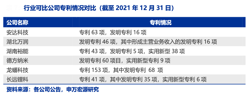 經(jīng)典案例:根據(jù)各公司公告、申萬宏源研究等綜合資訊表明,安達(dá)科技公司 2011 年引入比亞迪技術(shù)團(tuán)隊(duì),19 年做技改時(shí)比亞迪繼續(xù)指導(dǎo)公司做技改,經(jīng)過 10 多年耕耘,多項(xiàng)技術(shù)指標(biāo)達(dá)到國(guó)家先進(jìn)水平,共取得專利 63 項(xiàng),其中發(fā)明專利 16 項(xiàng)。在磷酸鐵鋰領(lǐng)域,其與湖北萬潤(rùn)發(fā)明專 利數(shù)相同、比湖南裕能專利數(shù)量多,研發(fā)能力處于行業(yè)前列。