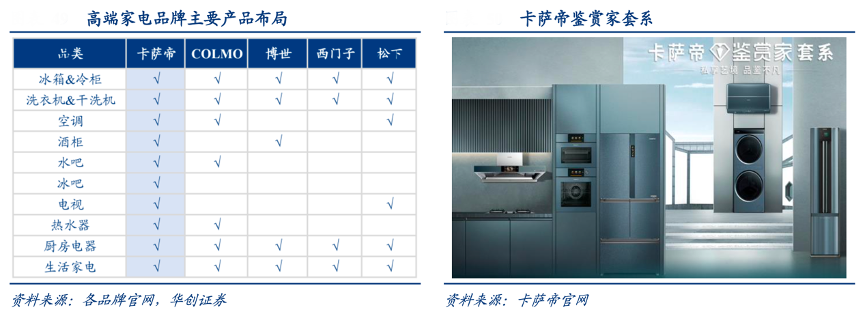 經(jīng)典案例:根據(jù)各品牌官網(wǎng)、卡薩帝官網(wǎng)、華創(chuàng)證券等綜合資訊表明,卡薩帝實現(xiàn)全品類布局,首創(chuàng)高端化套系產(chǎn)品。相較于其他高端品牌,卡薩帝不僅覆蓋了冰洗空等傳統(tǒng)家電產(chǎn)品,還擁有熱水器、廚電、酒柜等其他品類,是當(dāng)前國內(nèi)覆蓋品類最全面的高端品牌。在此基礎(chǔ)上進一步推出鑒賞家、指揮家等套系化產(chǎn)品系列,深挖用戶場景需求。