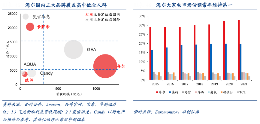 經(jīng)典案例:根據(jù)公司公告、Amazon、品牌官網(wǎng)、京東、Euromonitor、華創(chuàng)證券等綜合資訊表明,海爾系旗下共擁有七大品牌,其中主品牌海爾、卡薩帝以及統(tǒng)帥主要面向國內(nèi),分別定位中高低端家電市場,實現(xiàn)了用戶客群的全覆蓋。根據(jù) Euromonitor 數(shù)據(jù)顯示,在國內(nèi)大家電市場中海爾以超過30%的市占率長期穩(wěn)居第一,并且份額仍在持續(xù)提升,說明公司產(chǎn)品得到消費者的深度認(rèn)可, 競爭優(yōu)勢不斷擴大,為套系場景化銷售創(chuàng)造基礎(chǔ)。